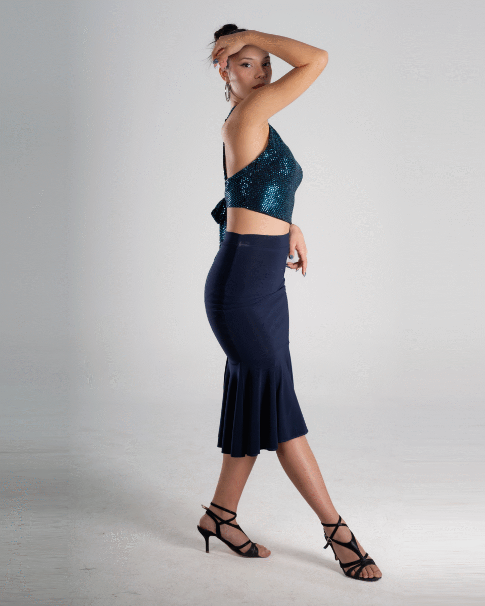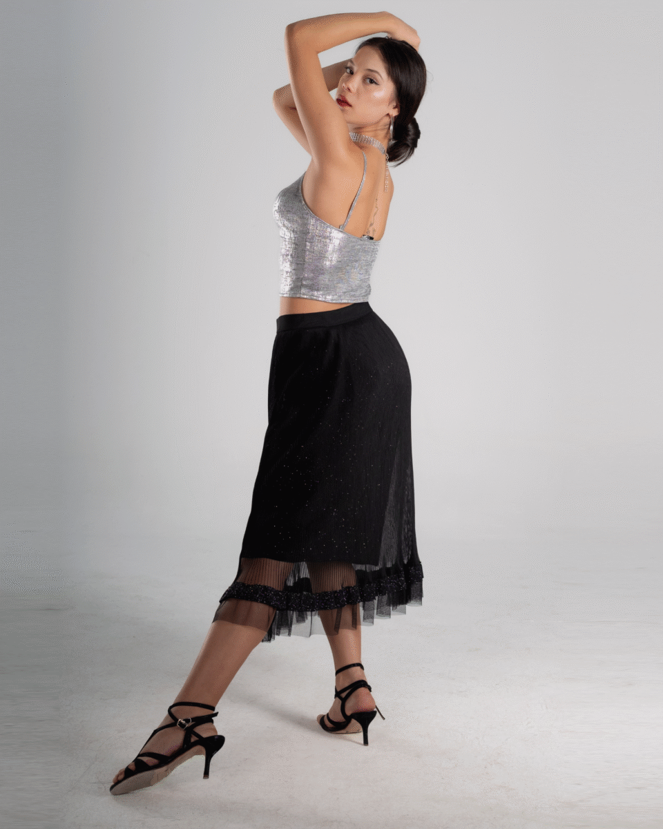 The Silver Grid High-Waist Tango Skirt introduces a striking metallic texture with a structured grid shimmer. The high-waist cut sculpts and elongates the figure, while the sleek pencil silhouette enhances clean lines and precise footwork. The subtle shine catches the milonga lights effortlessly, making every step luminous.