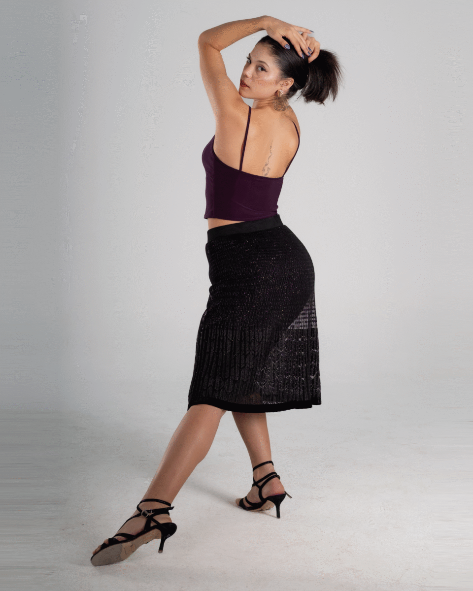 Together, velvet and metallic grid create a powerful balance — soft and intense above, sharp and modern below. This combo is perfect for gala milongas, tango festivals, stage moments, and unforgettable entrances. Both pieces can also be styled separately, offering maximum versatility.
