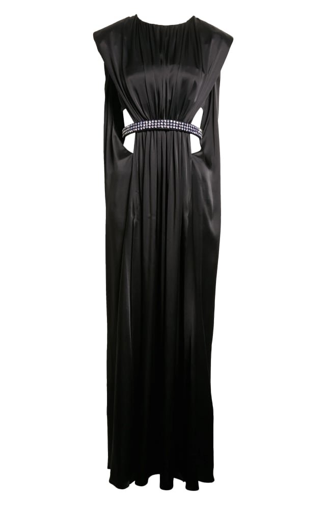 Crystal Embellished Cutout Pleated Satin Maxi Dress
