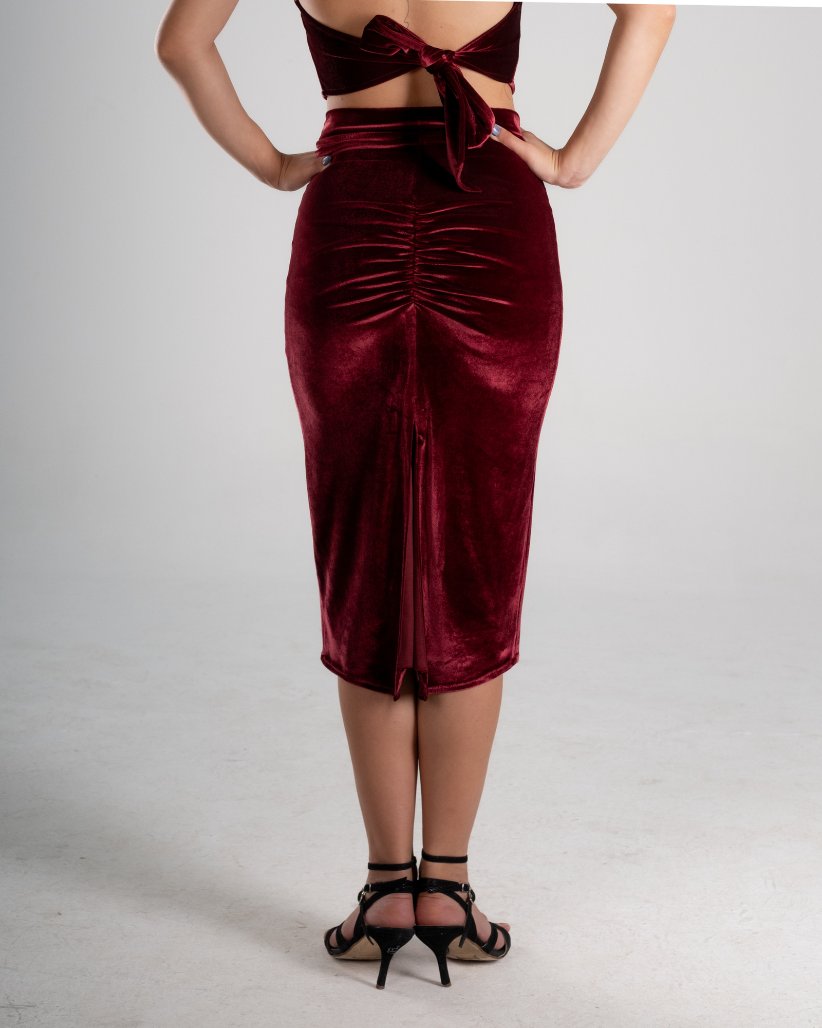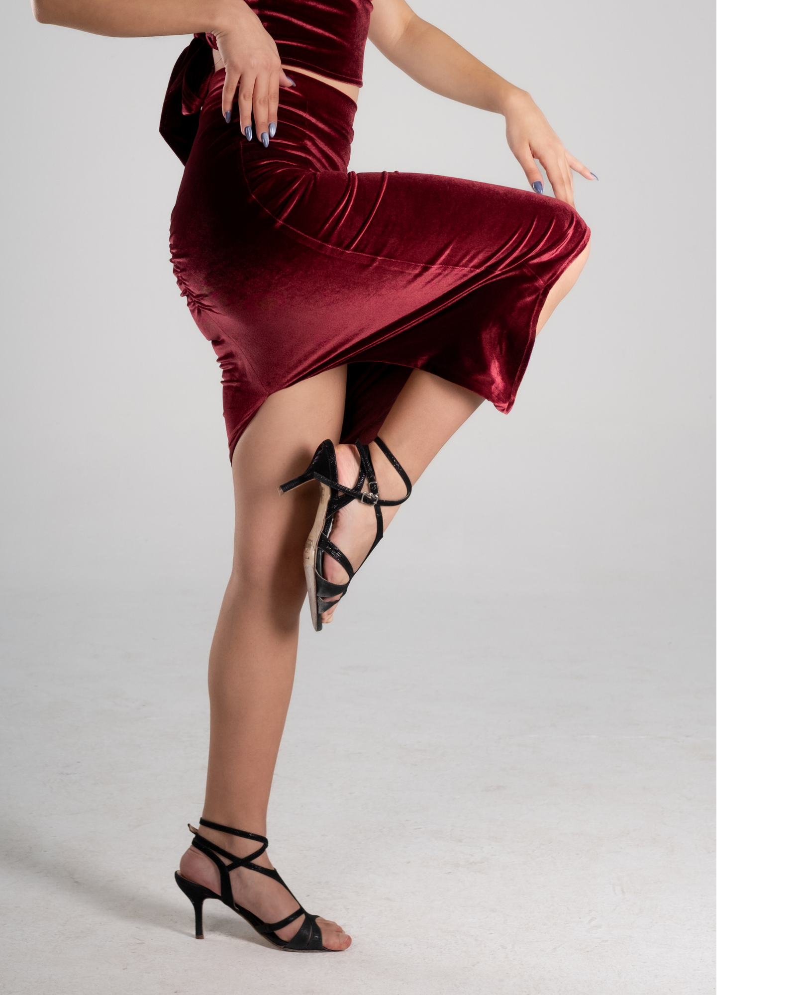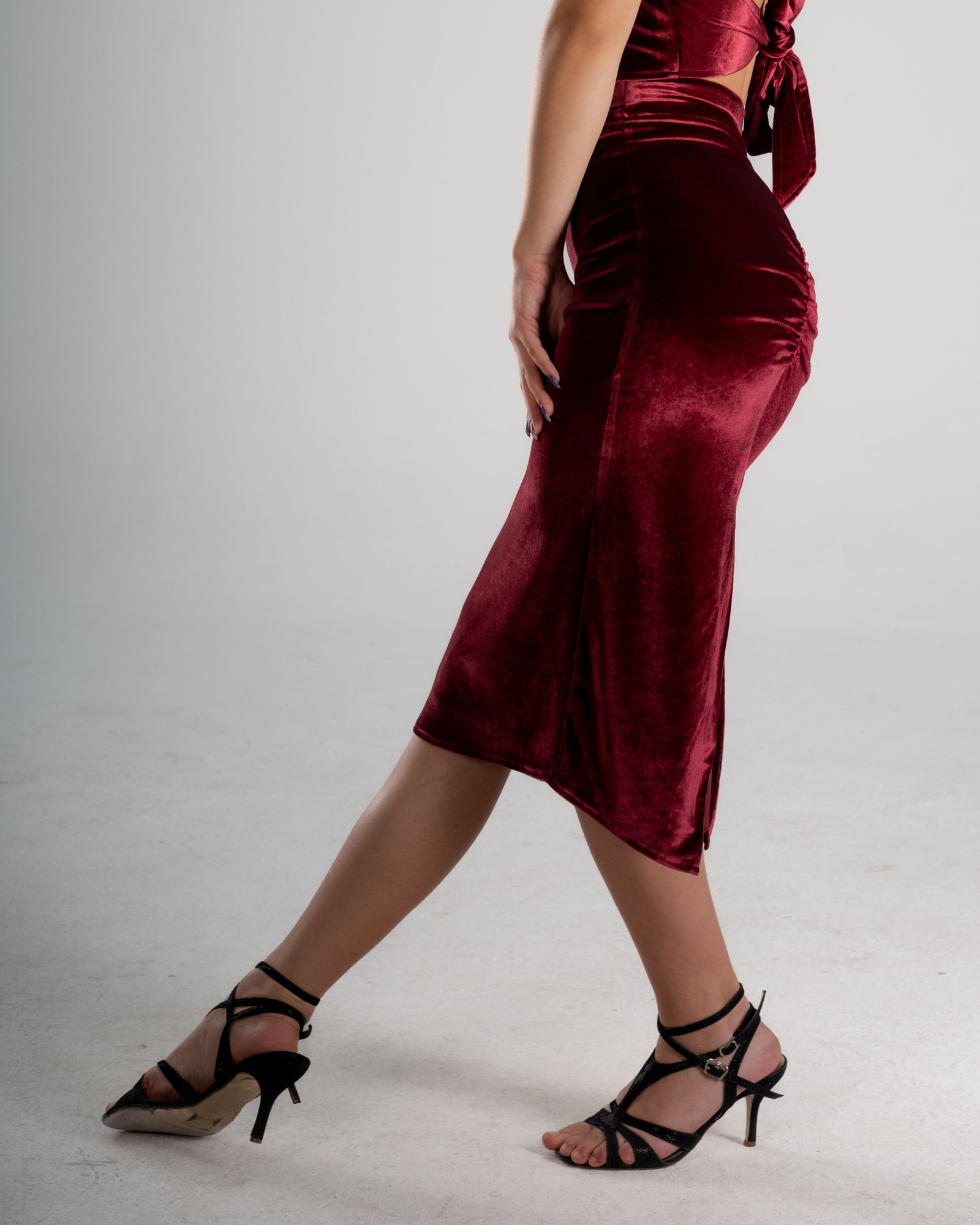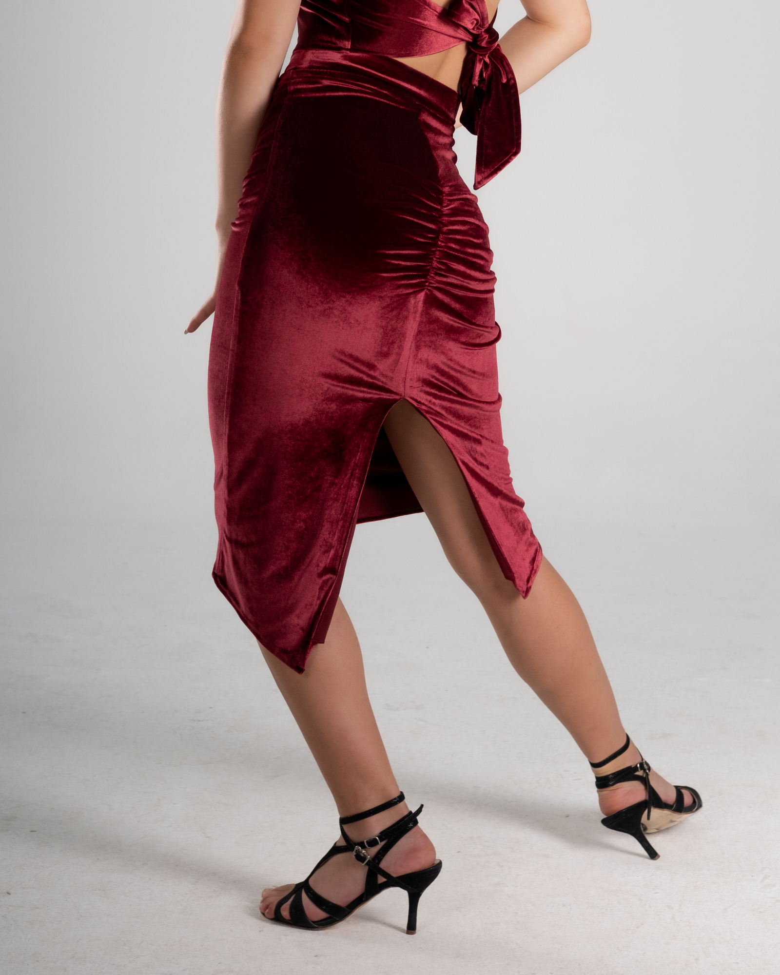 The Burgundy Velvet High-Waist Tango Skirt is created for dancers who seek depth, sensuality, and fluid control in movement. The rich burgundy velvet adds a warm, tactile elegance, making this skirt ideal for intimate milongas, performances, and long nights of dancing.