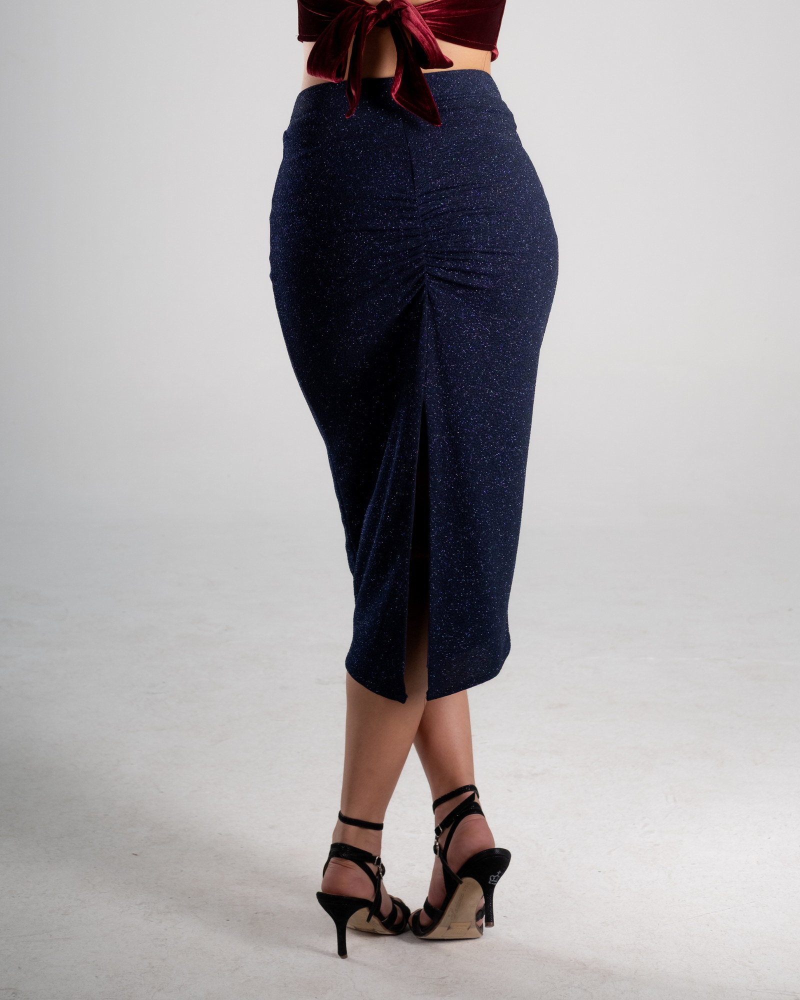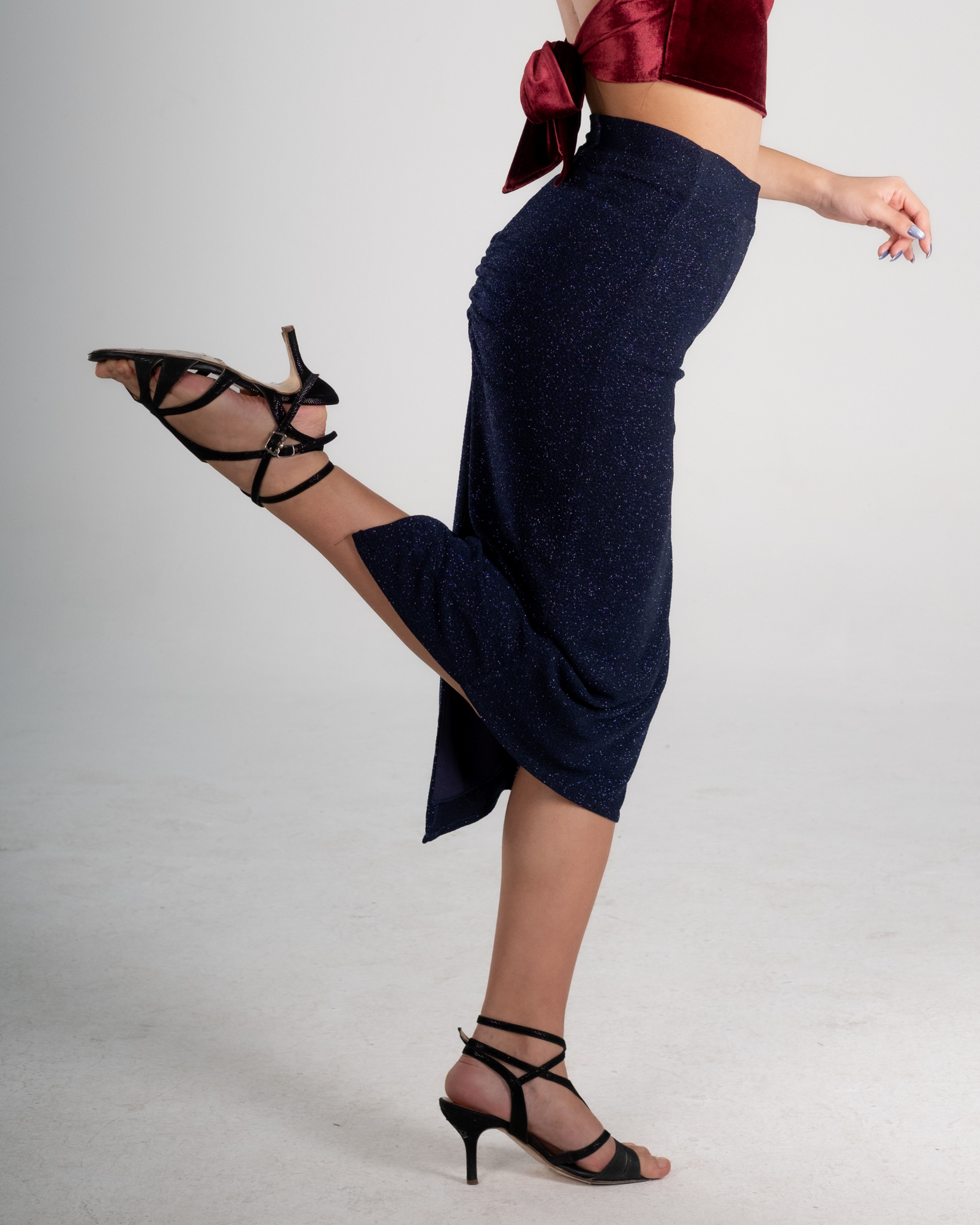 A back slit provides ease and freedom during walks and turns, enhancing tango’s characteristic flow while maintaining an elegant line. This skirt pairs beautifully with velvet tops, metallic textures, and refined crop silhouettes.
